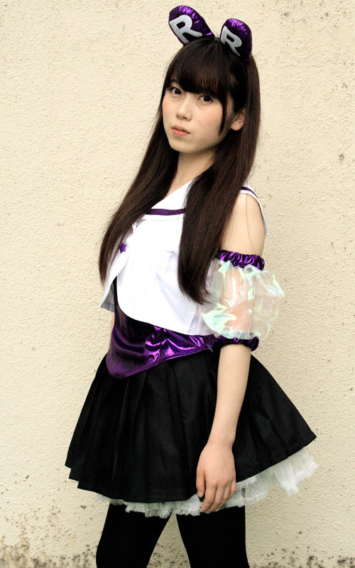 光沢のあるパープルカラーのインナーに、ミニ丈の襟付きベストがキュート!アームカバーやカチューシャ、パニエまで付属したなりきりアイドル衣装です。