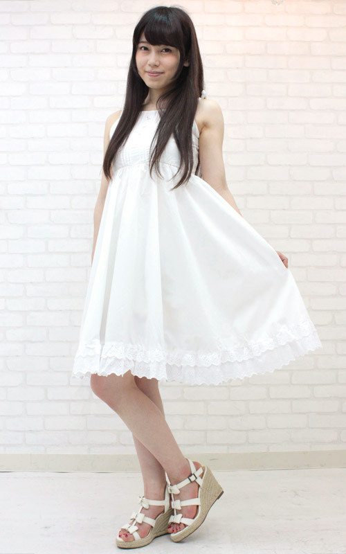 ピンタックやレース、背面のシャーリングなどで、お嬢様風にデコレートしたワンピースです。