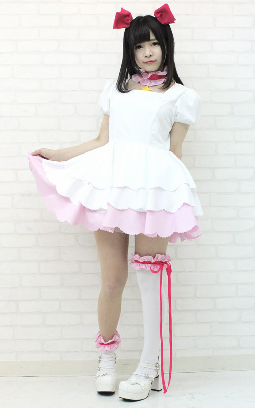 白を基調としたワンピは3段のスカートになっていて、とってもキュート!また、ワンピース、小物のそれぞれを2種類のピンクで仕上げた色使いにも注目!髪飾り(ピン留め)、チョーカー、キャットガーターがセットのお買い得コスチュームです。