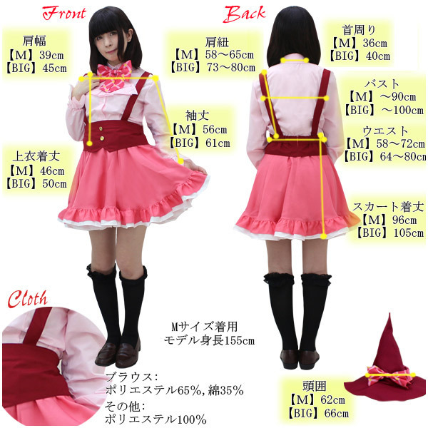 Mサイズ:B〜90cm・W58〜72cm ブラウス(肩幅39cm、袖丈57〜60cm、着丈58cm、首回り36cm) スカート(丈46cm、肩紐58〜65cm) 帽子:頭囲62cm セット内容:ブラウス(前ボタン・袖口ゴム)、フリルタイ、リボン、肩紐付きスカート、ケープ(前スナップボタン留め)、リボン付き帽子(リボン固定用のスナップボタン付)